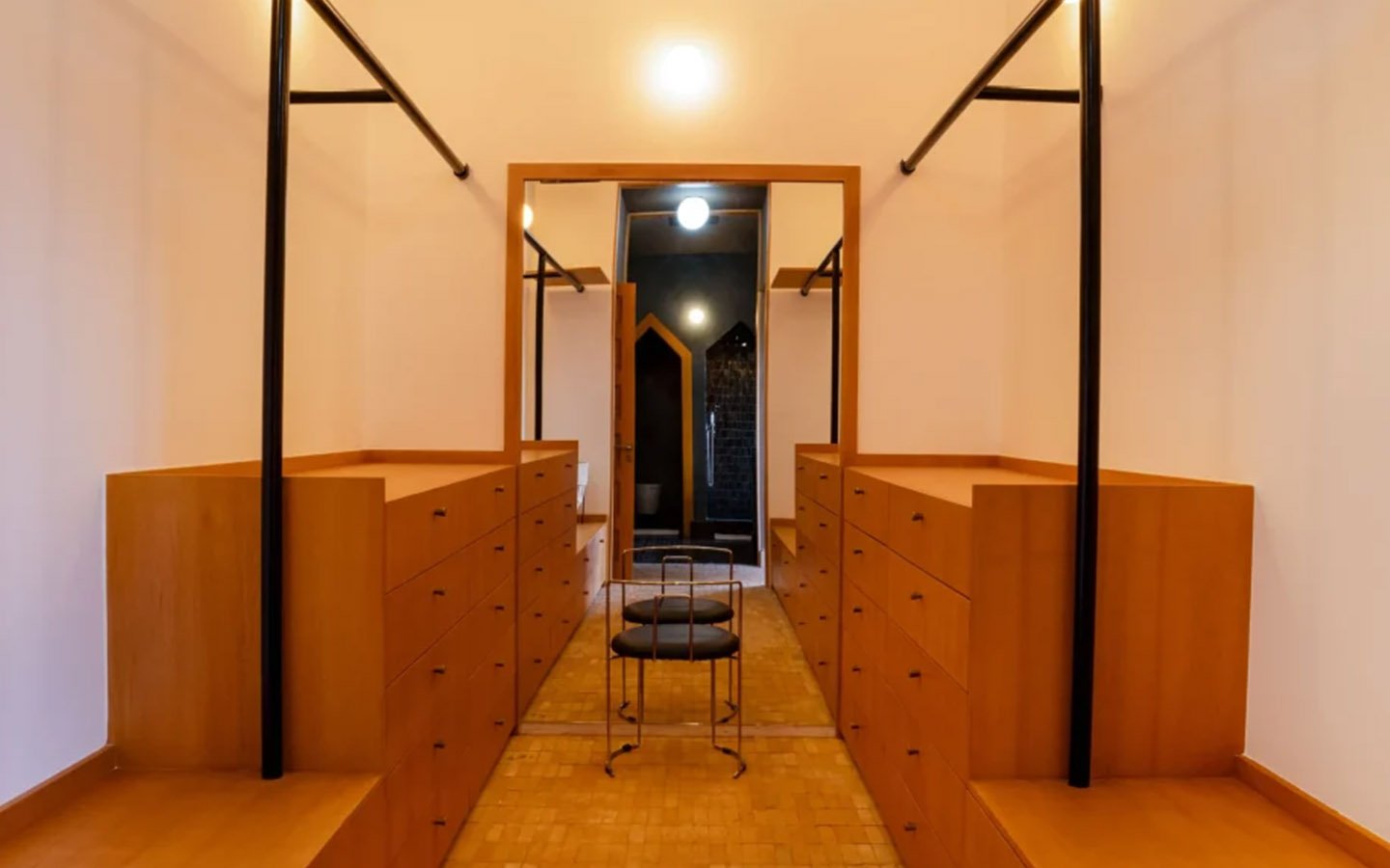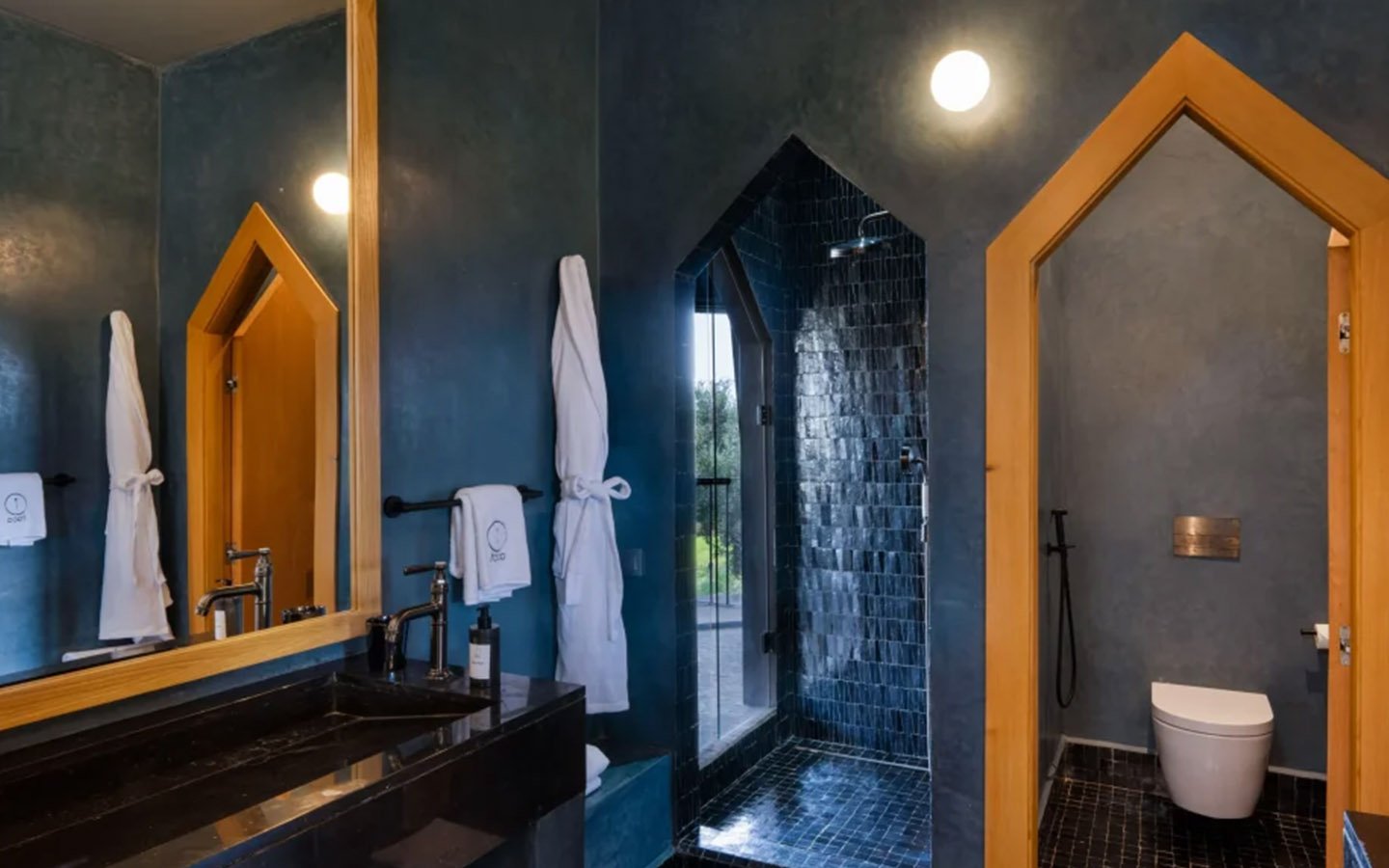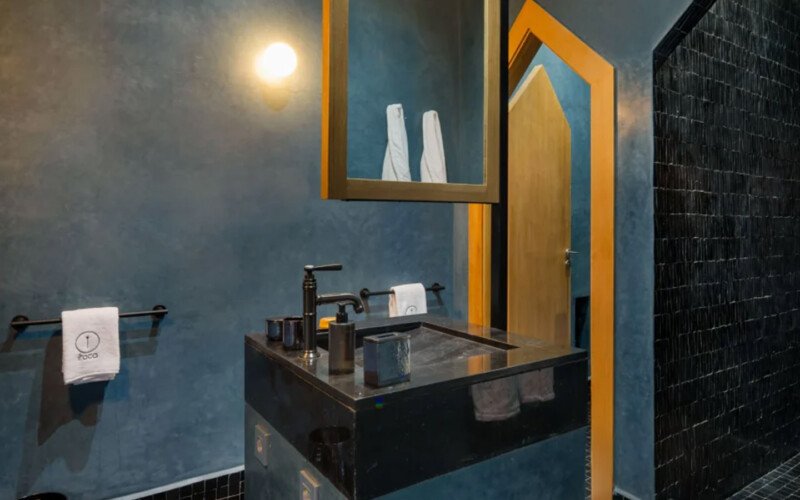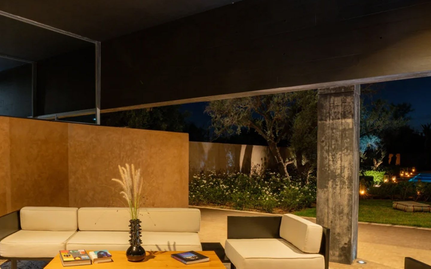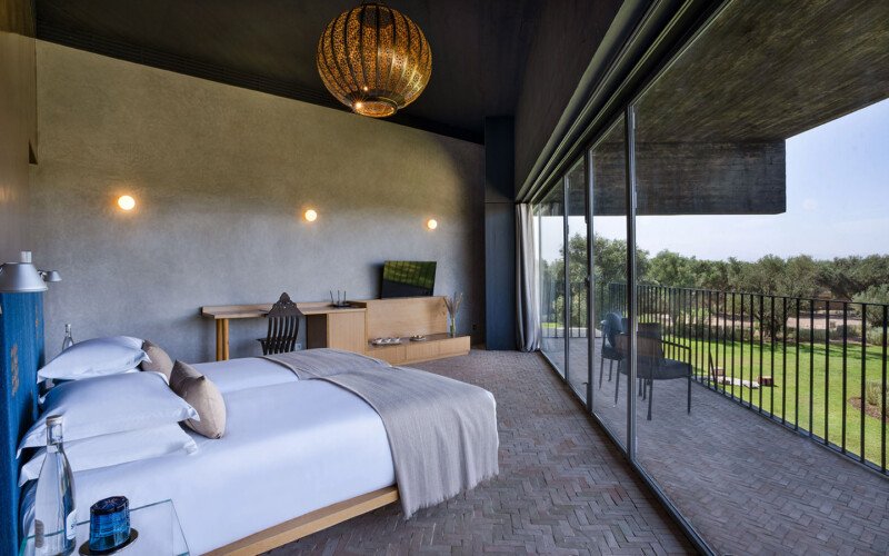 Discreetly nestled in an enchanting natural setting, Villa Escape is a sumptuous home with offbeat design where comfort and sophistication majestically combine. The private villa is bordered by four lush, distinct gardens and unfolds over a hectare and a half, offering six beautiful upstairs bedrooms ranging from 40 to 80 m², including two master bedrooms that provide intimacy and freedom. The interior contrasts apparent black concrete with traditional Moroccan materials, and features a large contemporary living room, a 130 m² swimming pool, a wellness area with a hammam and jacuzzi, a 25 m² fitness room, and a private cinema, creating a truly singular dwelling.