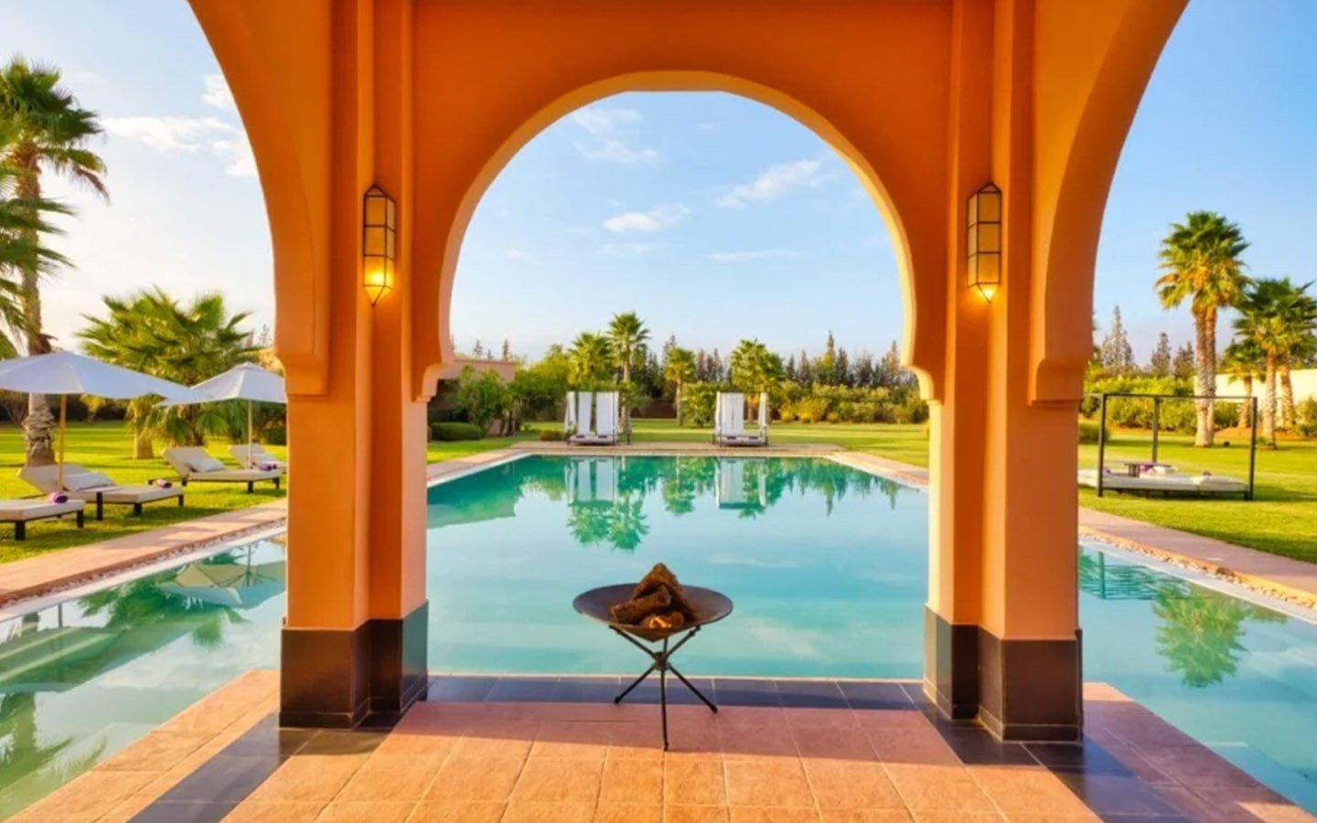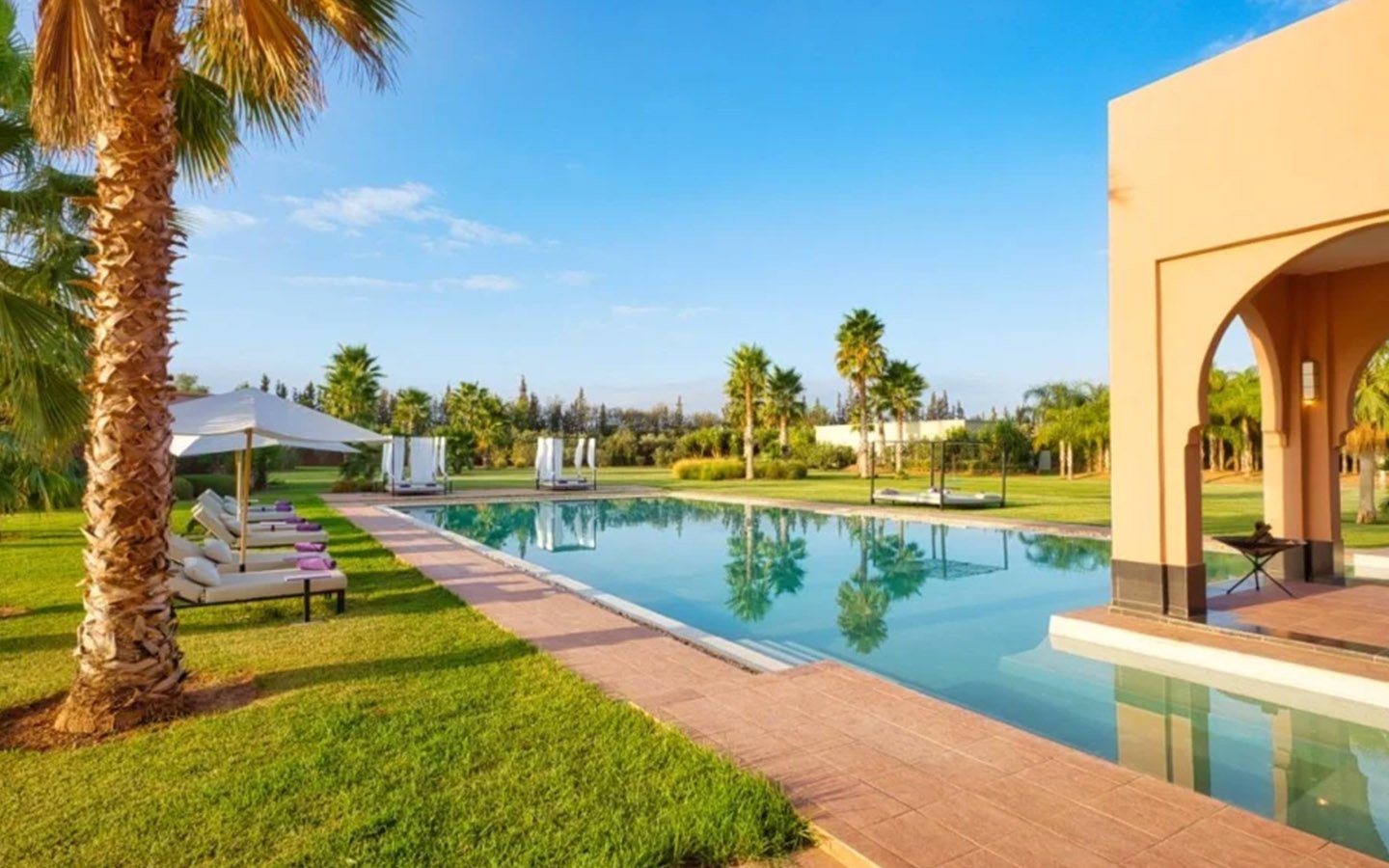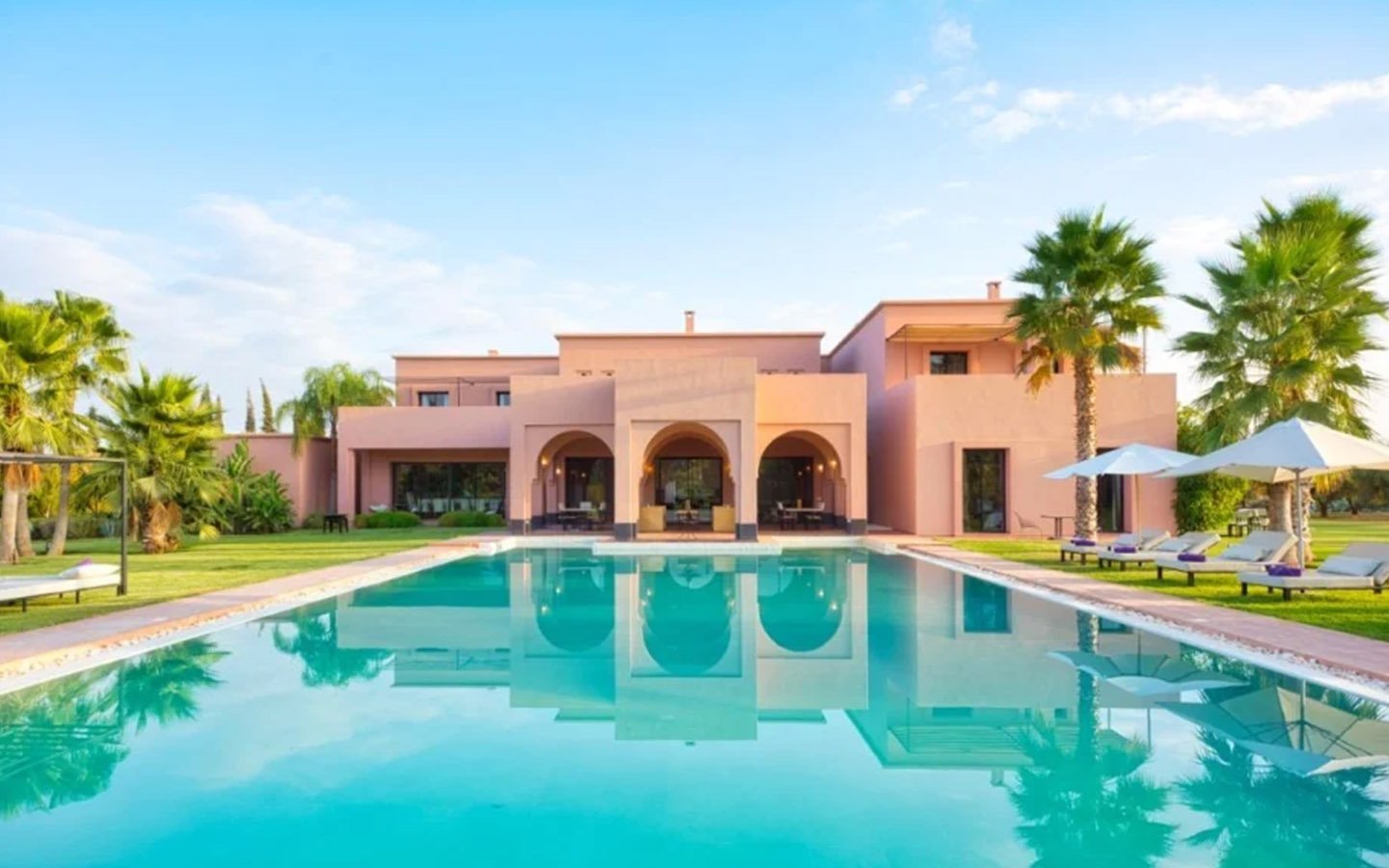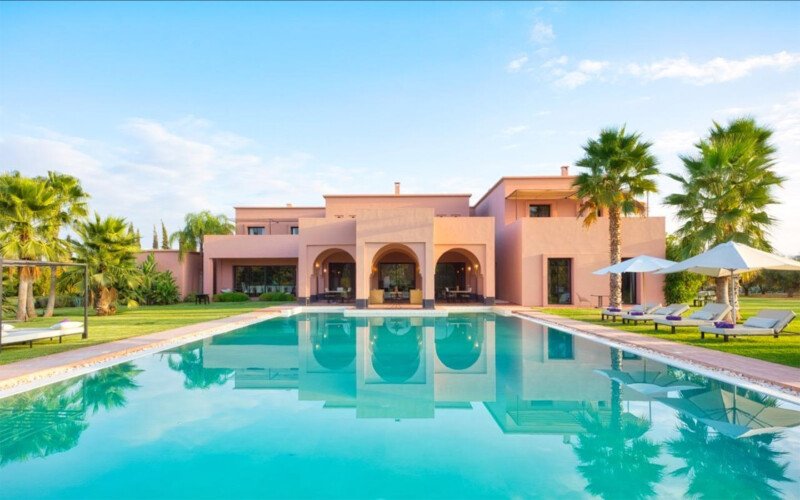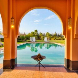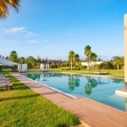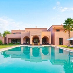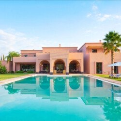 Nestled in a 17,000 m² green setting just 20 minutes south of Marrakech, Villa L’Albana is an exceptional property that embodies the Moroccan art of living in a luxurious, peaceful, and luminous environment. Its contemporary Arabo-Andalusian architecture, signed by one of the kingdom’s greatest architects, makes it a unique place facing the Atlas peaks, deploying majestic, light-filled volumes across 1,700 m² of living space. The villa features spectacular landscaped gardens, the largest heated private pool in Marrakech with integrated jacuzzis, a pool house with a bar, a fully equipped gym, a traditional hammam, a private cinema, and sumptuous suites, offering a complete 5-star experience with private chef and butler service available.