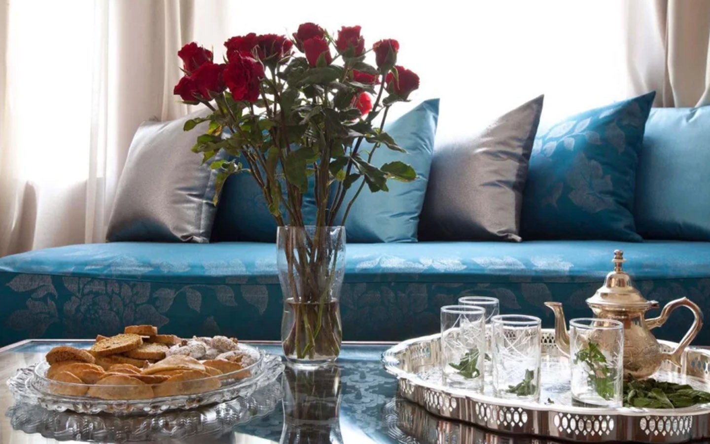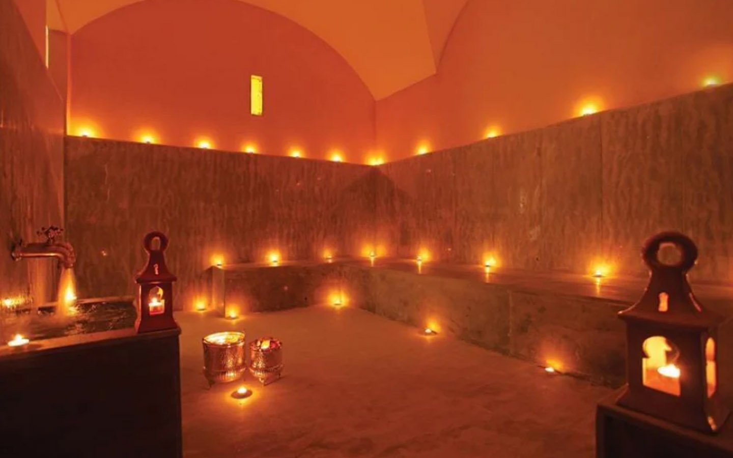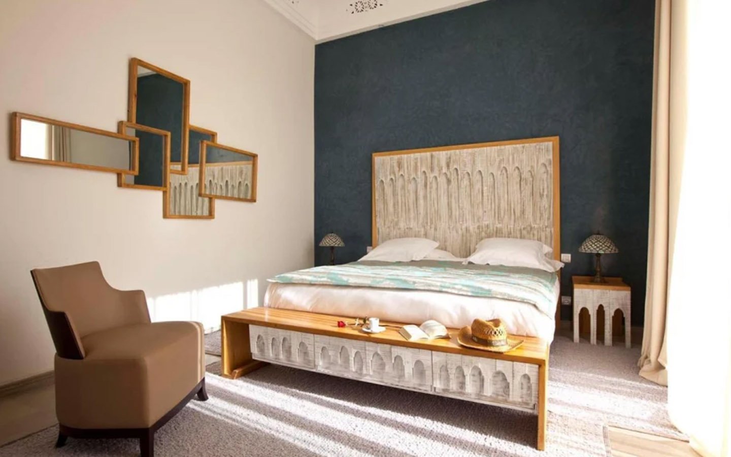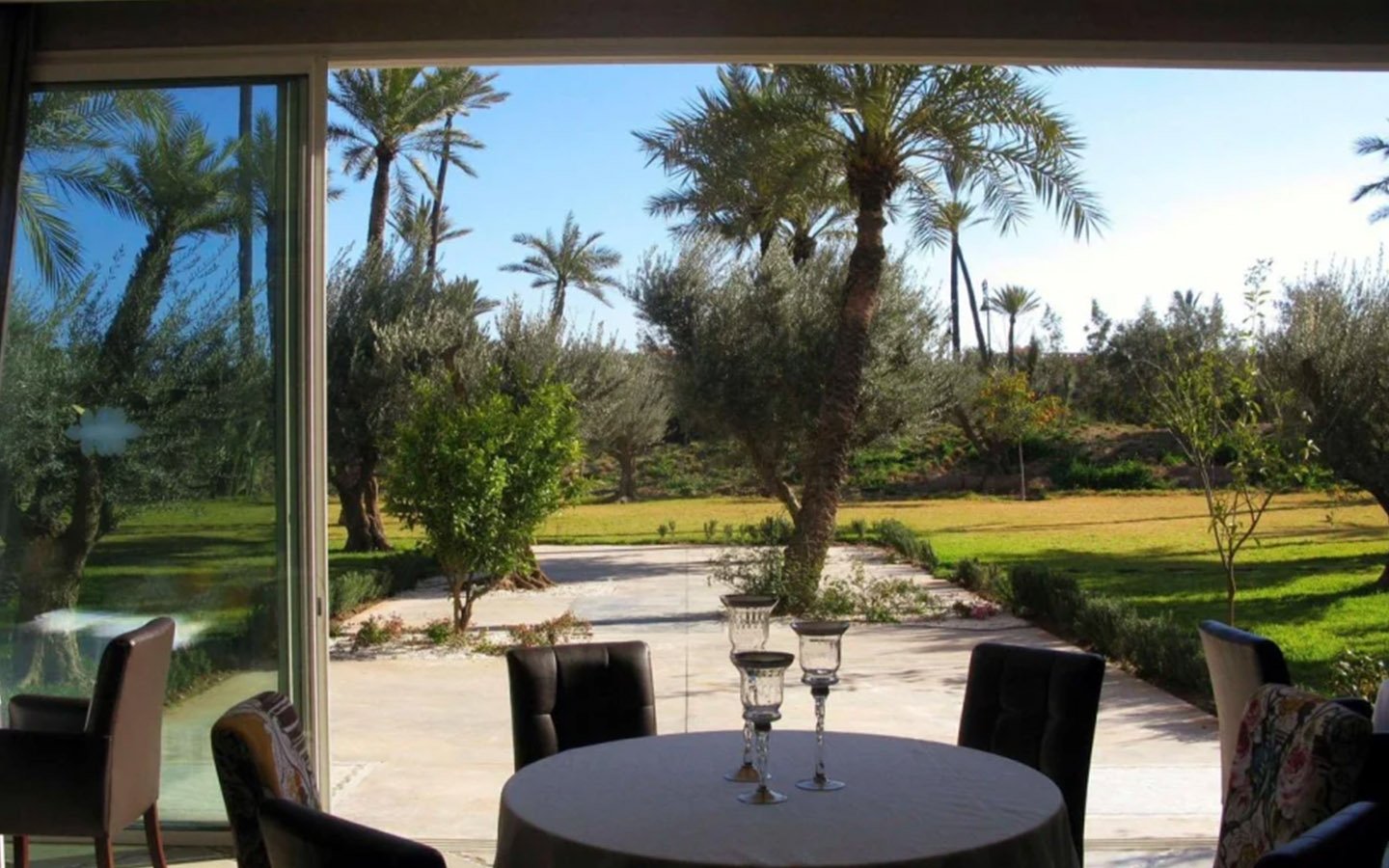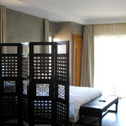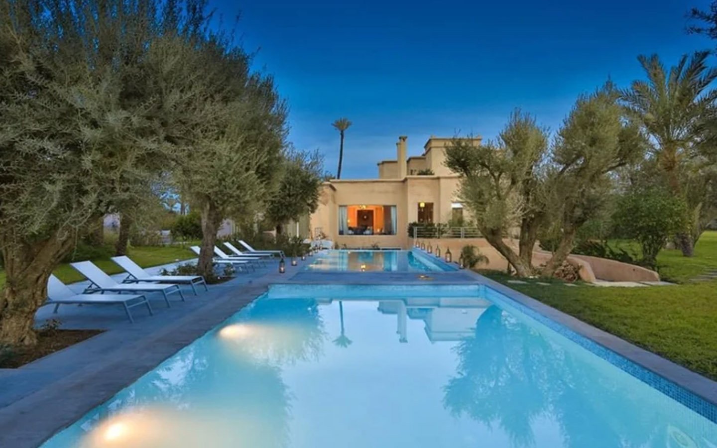 Upon entering Palais Rym, you are captivated by its vast, lush garden filled with majestic palm trees, fragrant bitter orange trees, and centuries-old olive trees, at the heart of which lies a refreshing pool with an ideal year-round temperature. This palace features intimate lounges with imposing fireplaces and 11 unique suites, each with a private terrace, creating an elegant setting for a romantic escape, family gathering, or special event. It is a true haven of wellness, complete with two hammams, a jacuzzi, a spa suite with a double jacuzzi, two massage rooms with individual bathtubs, and a fitness room.